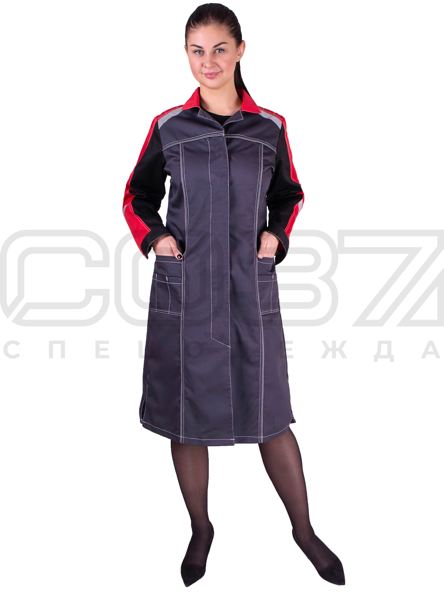 Халат рабочий женский "Мега" с СОП цв.серый/чёрн/красный тк.орион в Иваново