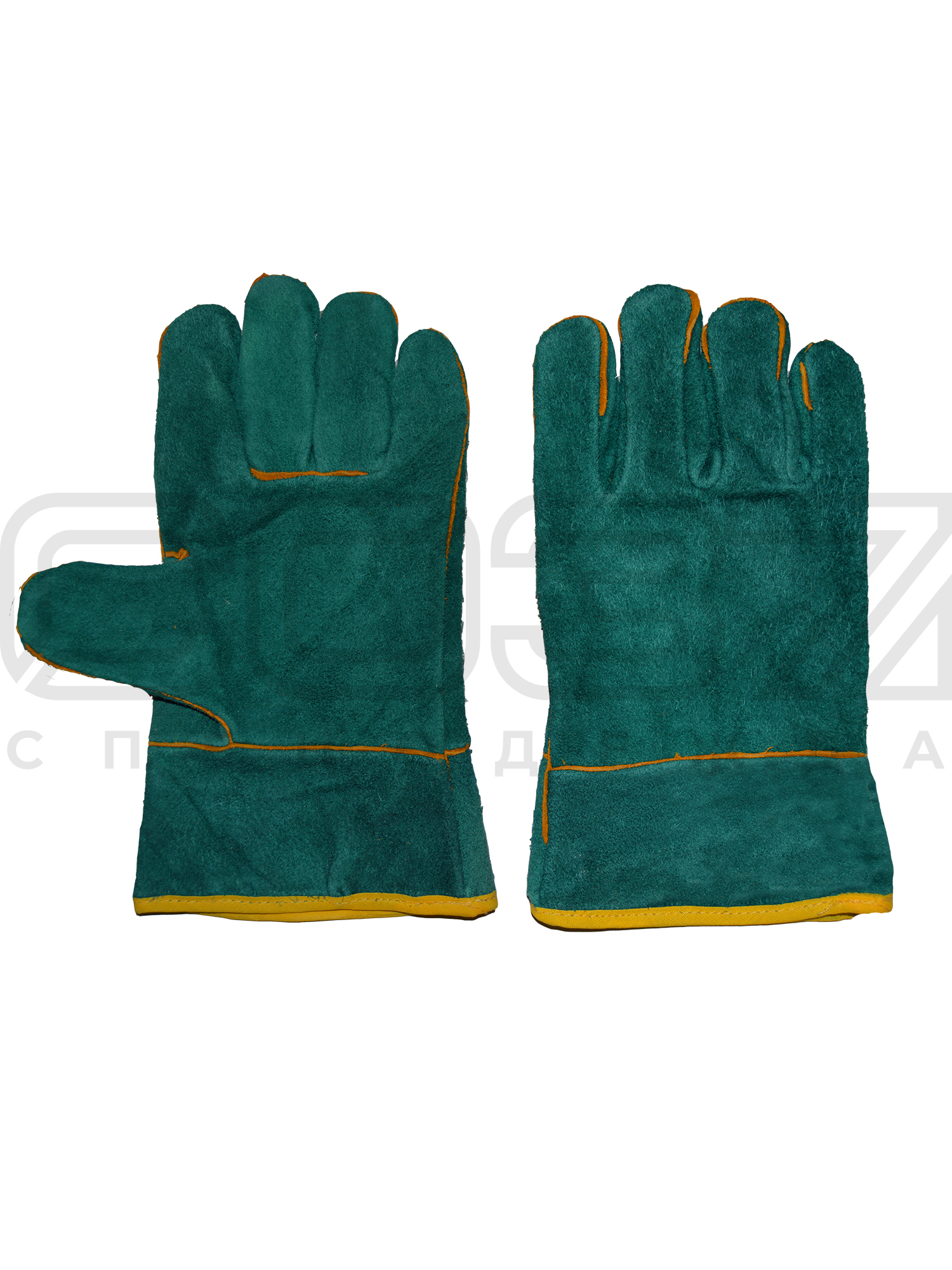 - Перчатки сшиты из высококачественного спилка КРС, равномерно прокрашенного в зелёный цвет.